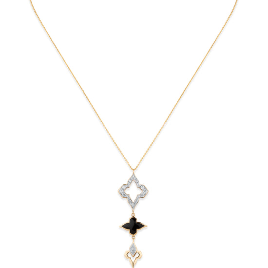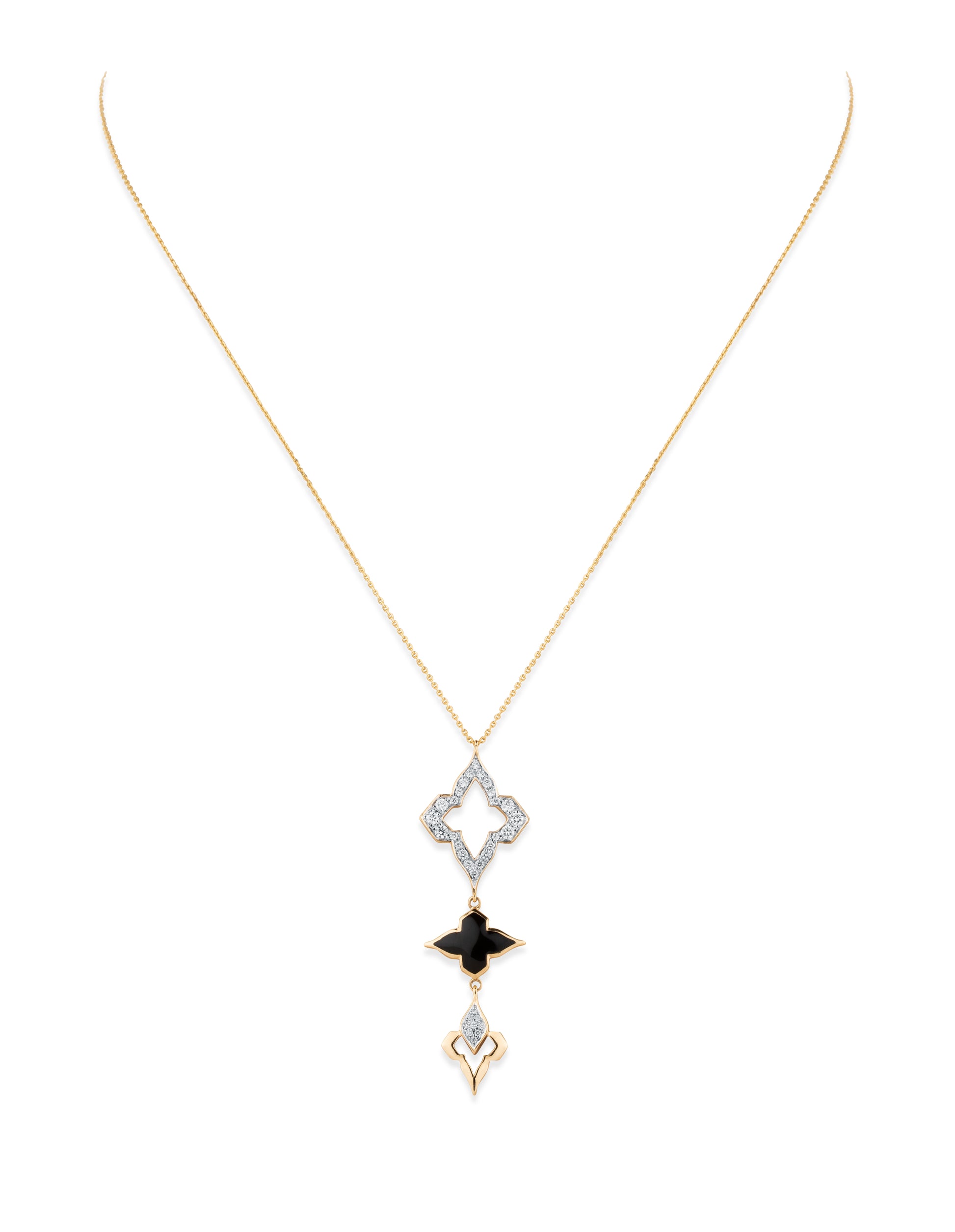 Designed in 18kt gold, brilliant diamonds and black ceramic, this classic Aayat necklace is for the woman who is unapologetic and will triumph against all the odds. The Chain Length 18 inches with adjustable links at 17inch and 16inch at the back.
