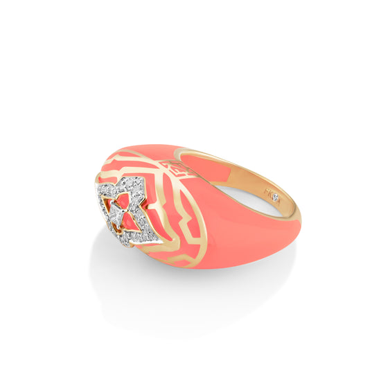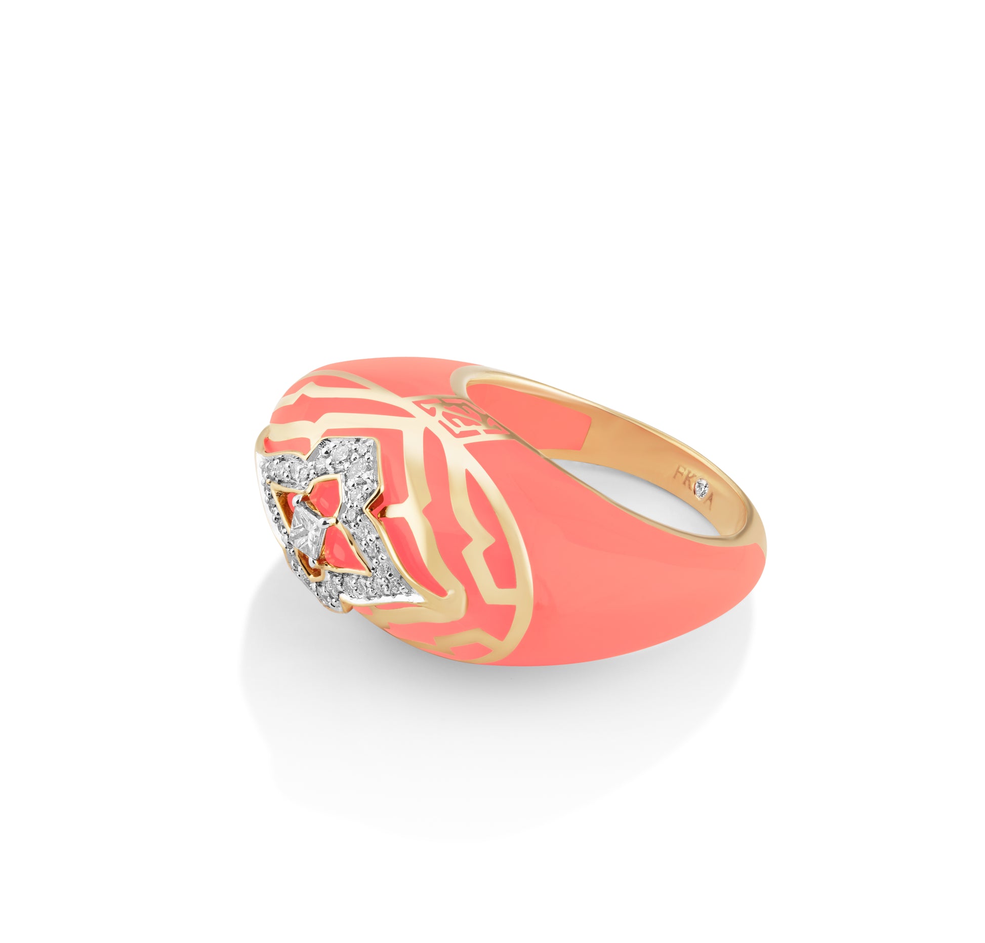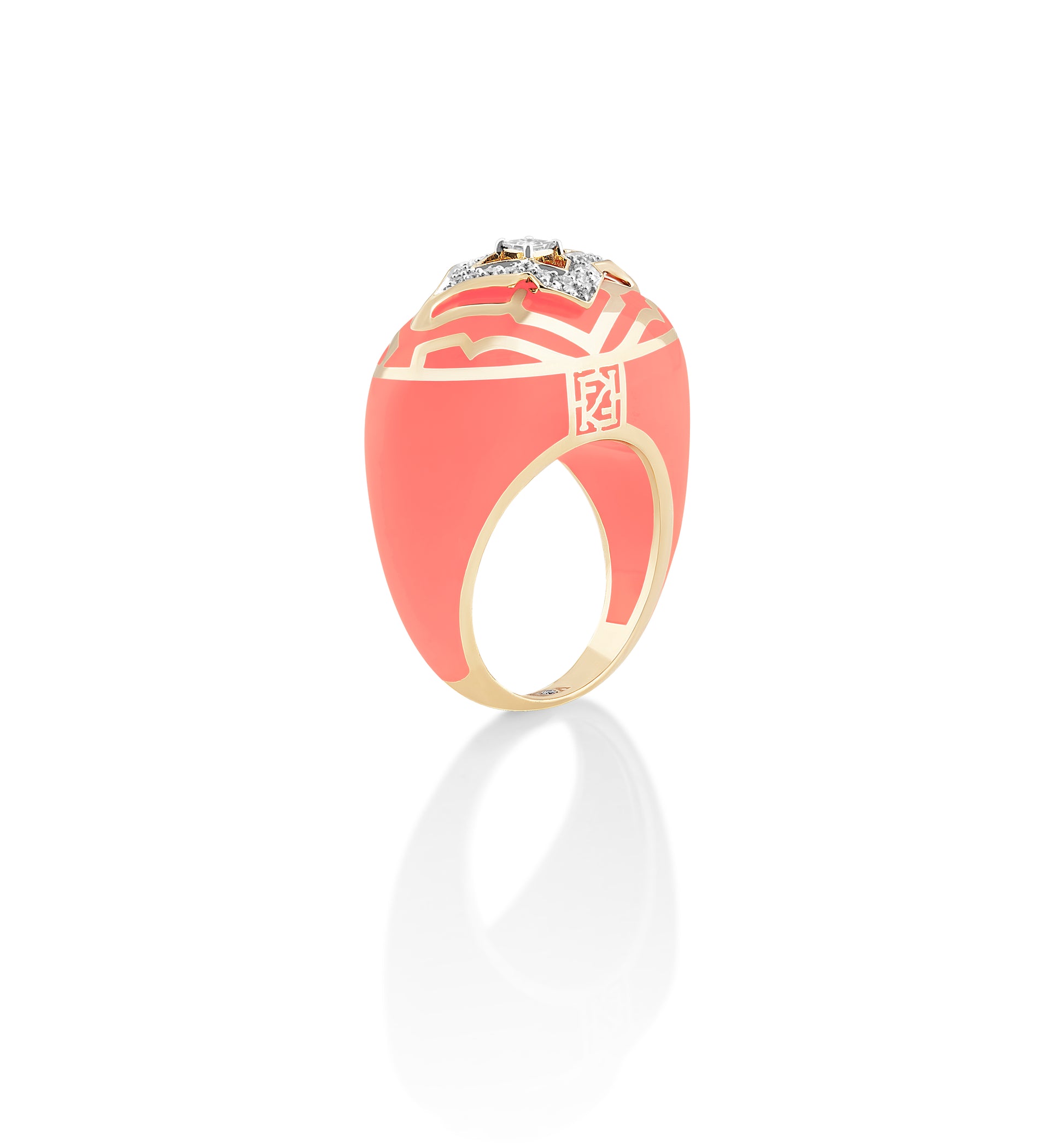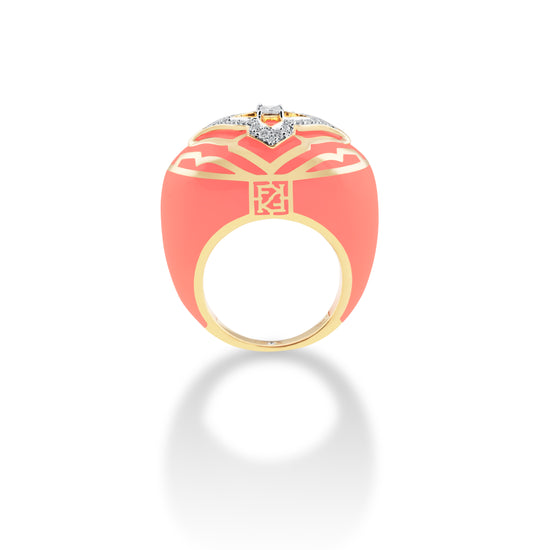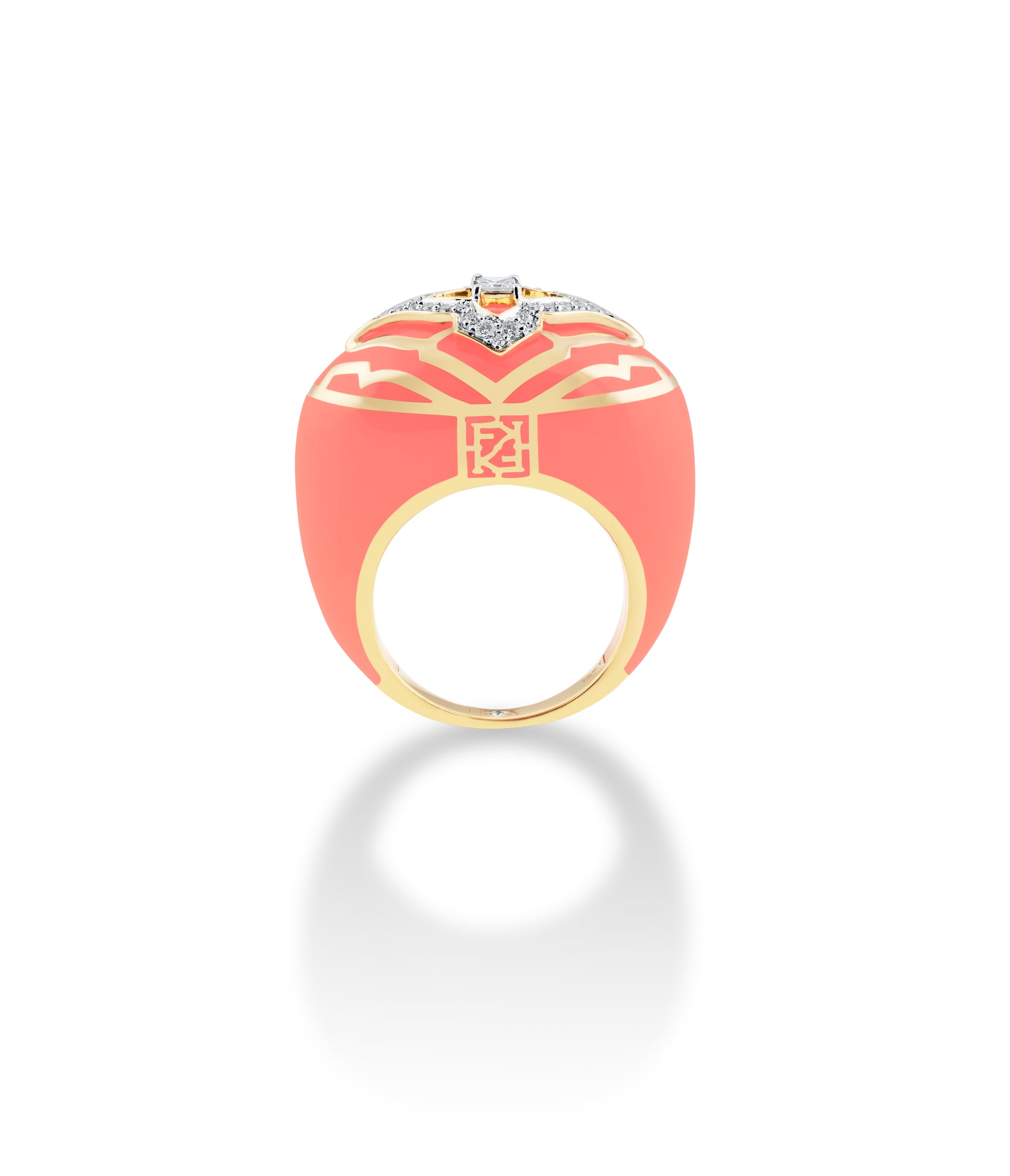 The Jaipur Vivacious ring is inspired from the Pink city of India 'Jaipur' that reflects the city's rich heritage and the romantic allure of its palaces. Crafted in 18kt gold, natural diamonds and ceramic this ring is for the fearless traveller for the cheerful who travels to experience new opportunities along her way.