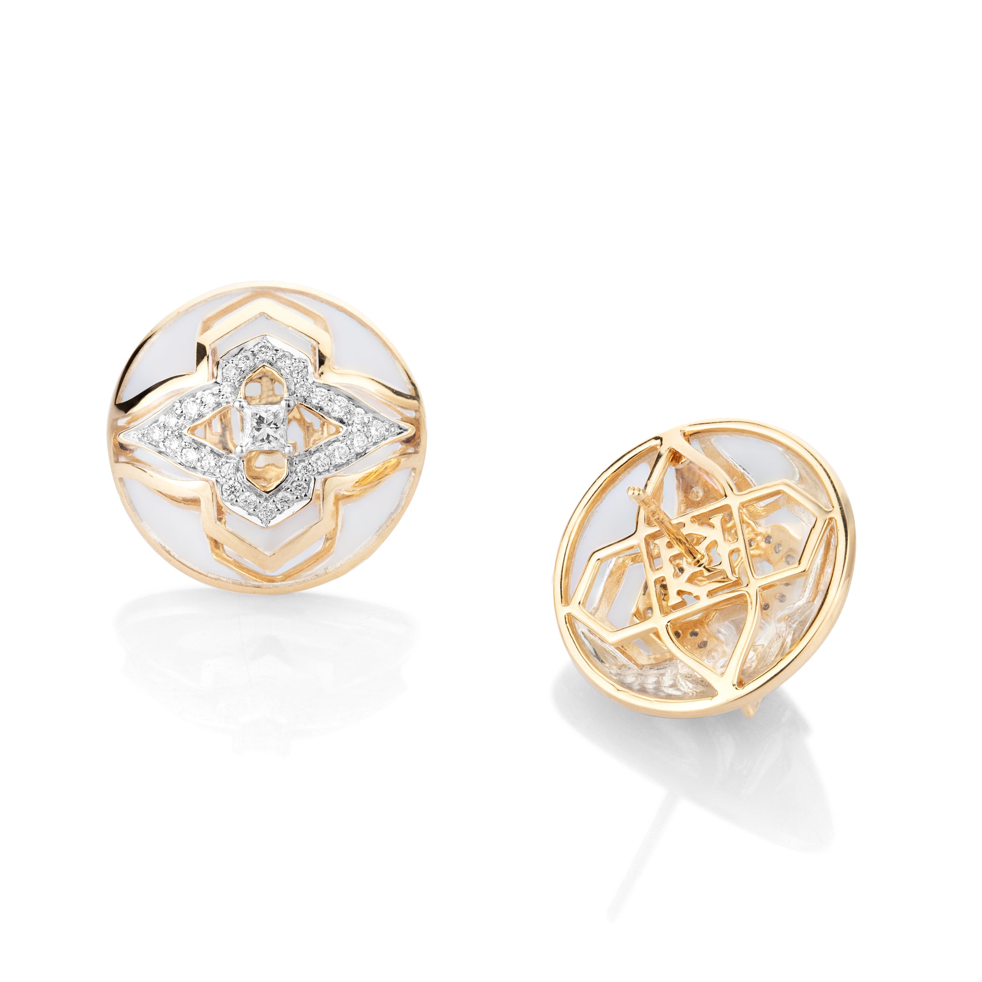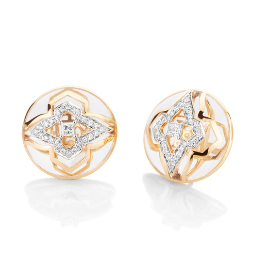 Inspired by the untouched, chaste and translucent heaven on earth Kashmir, these audacious earrings are for the fearless traveller who follows the world map just as finely as her inner map. It is masterfully crafted in ceramic with svelte lines of 18 kt gold and studded with natural diamonds.