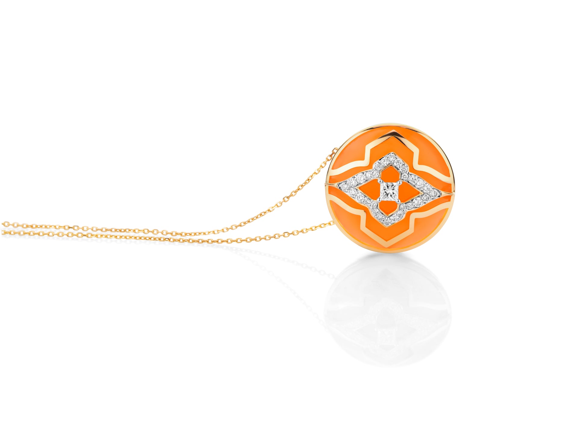 Inspired by bright orange golden sunsets of Mumbai and the buzzing energy of the city of dreams, this wanderlust pendant is for the traveller who follows her heart and travels to find herself new experiences. It is masterfully crafted in ceramic with svelte lines of 18 kt gold and studded with natural diamonds.