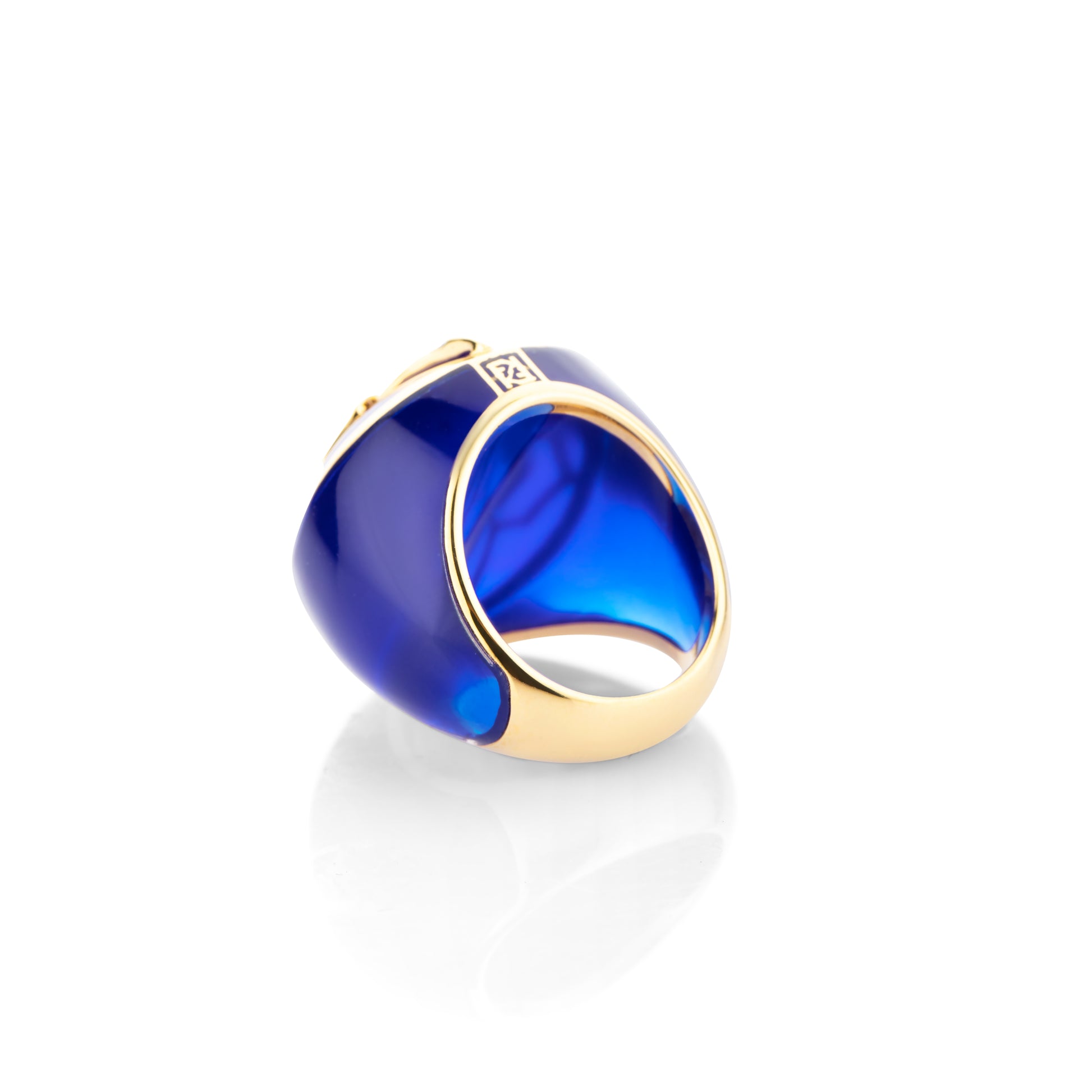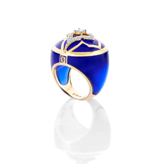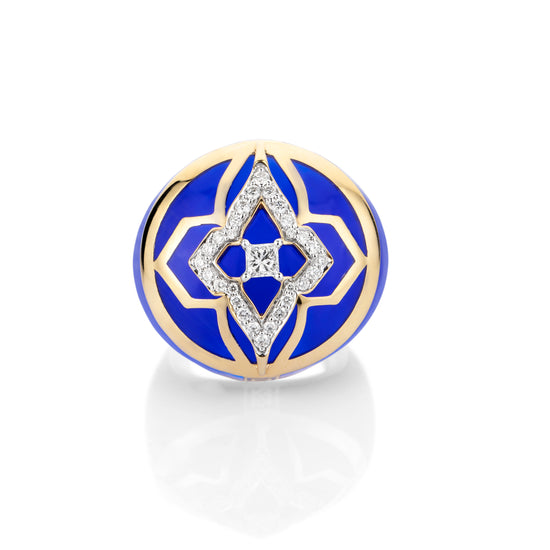 Inspired by the mystical deep blue of the Aegean sea and the color blue embedded in the architecture of Mykonos, this globetrotter ring is for the worldly refined traveller who makes a suave statement by being herself. It is masterfully crafted in ceramic with svelte lines of 18 kt gold and studded with natural diamonds.